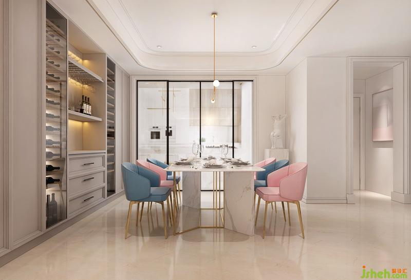 餐廳的收納柜做了虛實(shí)結(jié)合,一般隱藏收納,一半裝點(diǎn)展示,同時(shí)又空出一塊空間做了操作臺(tái),醒酒放置、咖啡沖泡、器皿拿取等,方便了使用。