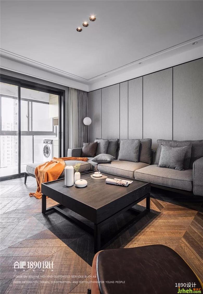 無主燈化的設(shè)計(jì),讓客廳空間簡約時(shí)尚,電視背景組合柜,滿足了平時(shí)展示與收納,煙熏色的魚骨拼地板,拉升了客廳高級輕奢感。