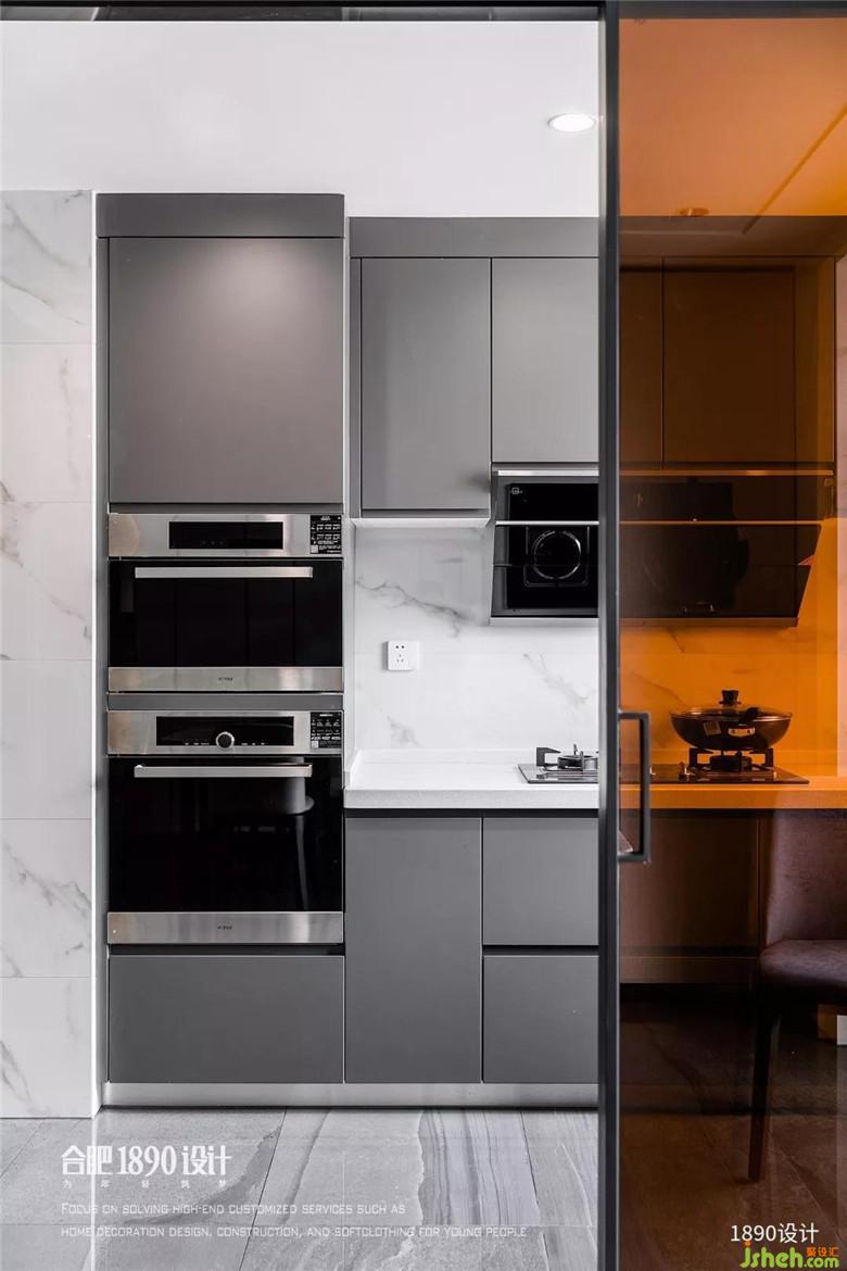 廚房櫥柜裝修公司采用高級灰色柜體與白色石材臺面,搭配時(shí)尚的灰色地磚與爵士白瓷磚,相互呼應(yīng),相得益彰。