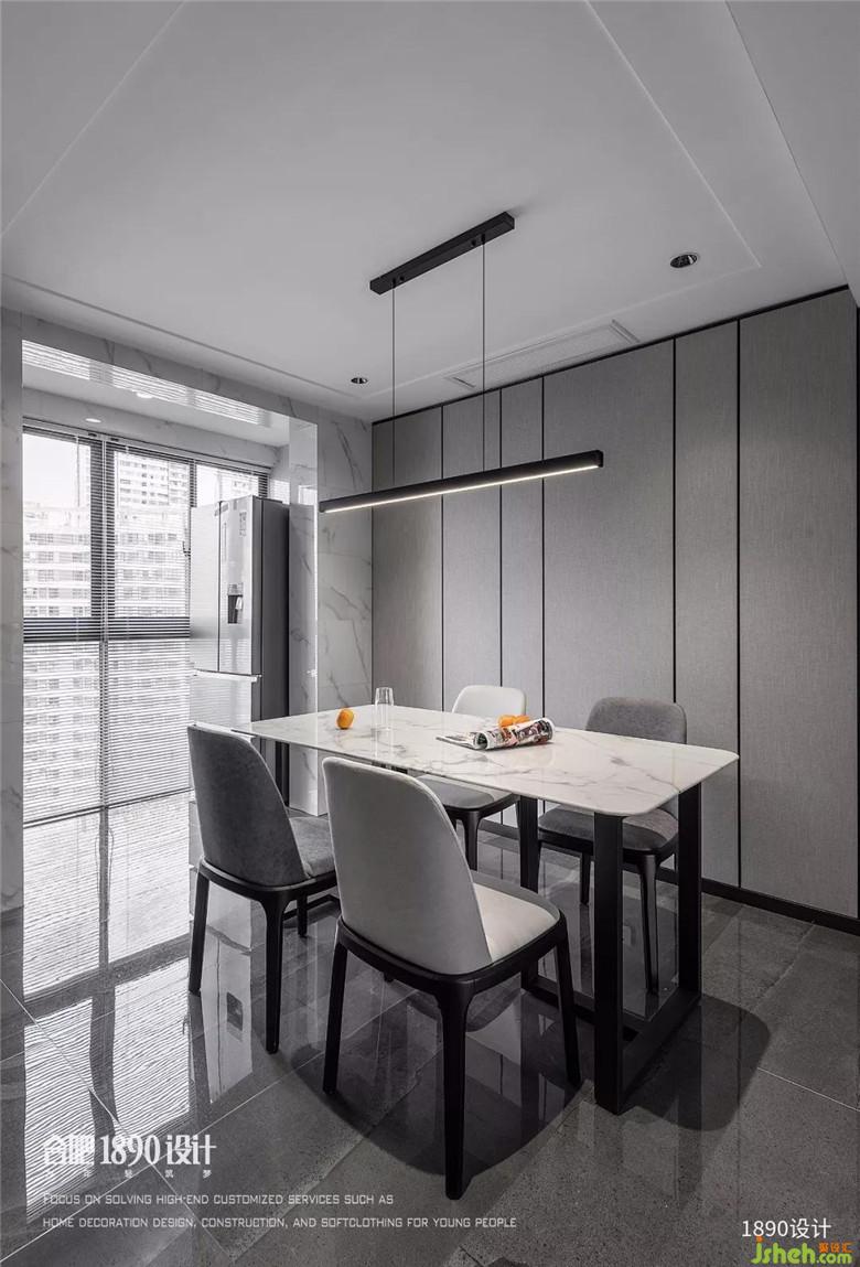 高級灰的布墻布系統(tǒng),不同分割的金屬線條點綴,提升空間的耐看度與品質(zhì)感,極簡的餐廳吊燈,聚焦視線,讓空間更有層次。