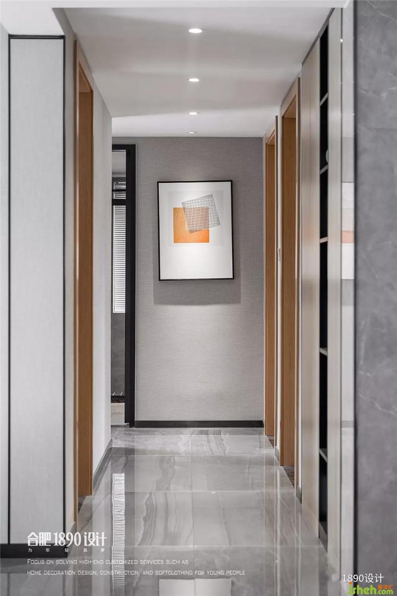 過道通過虛實的展示柜與到頂?shù)姆块T,讓干凈清爽,同時又豐富多彩。