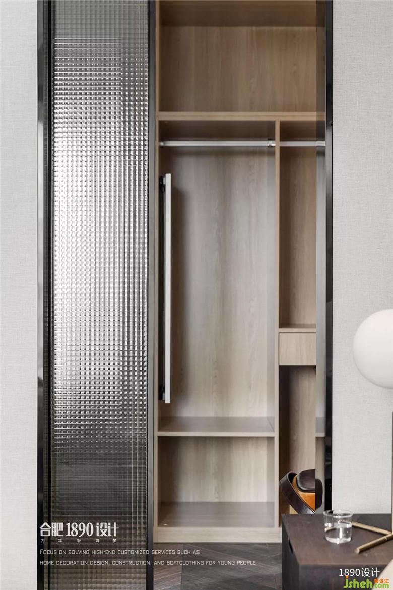 長虹玻璃的內(nèi)嵌移門拉開,內(nèi)部則是衣帽間,滿足女主人的衣物收納與梳妝功能。