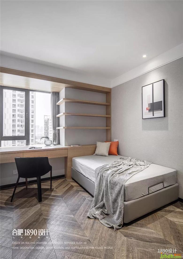 利用拐角的結(jié)構(gòu),做了一組寫字桌和書架收納展示,整體色系提升了兩個度,讓孩子房子相對明亮,且不失整體空間格調(diào)品質(zhì)。