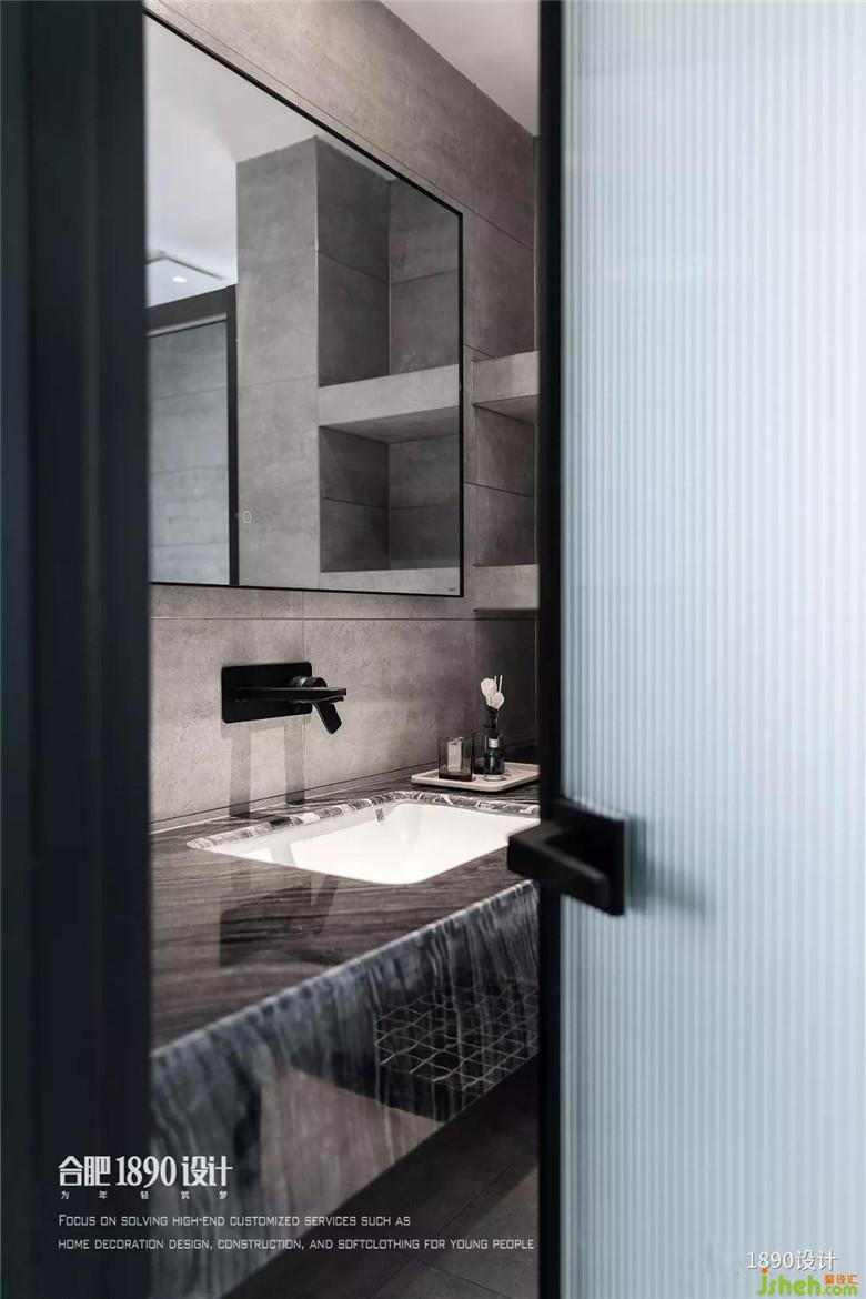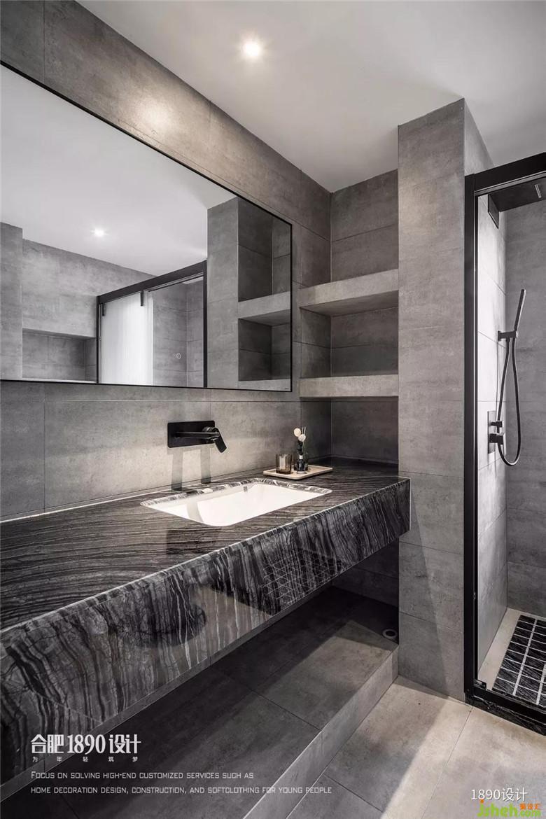 延續(xù)整體風(fēng)格的色系,采用啞光面的灰色系瓷磚,搭配現(xiàn)代極簡的黑色長虹磨砂門,顯得個性時尚。