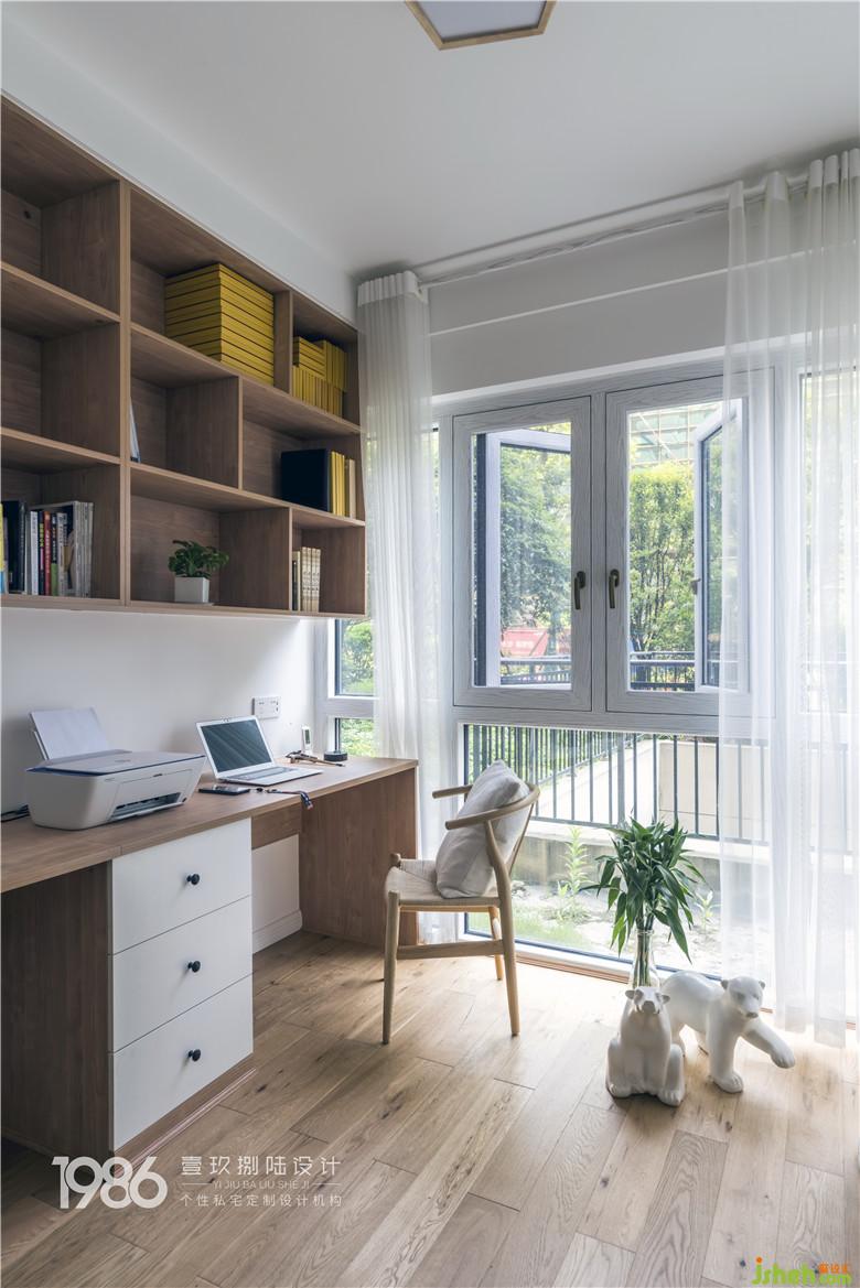 書房在布局時(shí)便將它與臥房區(qū)域分隔開來(lái),在玄關(guān)旁邊遠(yuǎn)離需要安靜的睡眠區(qū)域,在這里主人可以安心學(xué)習(xí)和工作。為了讓兩位主人學(xué)習(xí)工作時(shí)不沖突,室內(nèi)設(shè)計(jì)師給書房設(shè)計(jì)了兩人位的書桌。