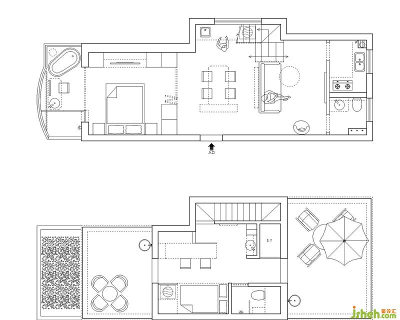 上海裝修設(shè)計原始戶型圖 一樓45平,原始樓梯在進門右側(cè),進去之后比較壓抑,客廳空間也不夠完整,餐廳也沒有好的位置放置,如果把玄關(guān)+樓梯+客廳+餐廳在現(xiàn)有房型空間結(jié)構(gòu)上去設(shè)計很尷尬、擁簇。 閣樓本身就十幾個平方有個斜頂,正常使用的空間很有限。
