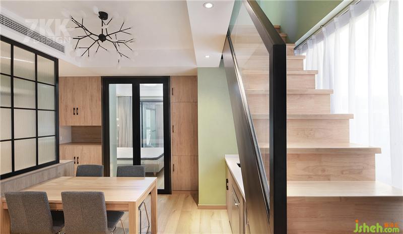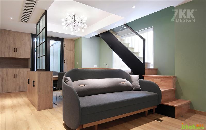 深灰色硬朗線條的樓梯扶手搭配暖色木質(zhì)臺階,墻面大面積采用屋主比較喜歡的薄荷綠搭配,呈現(xiàn)一種清新溫馨的居家環(huán)境。