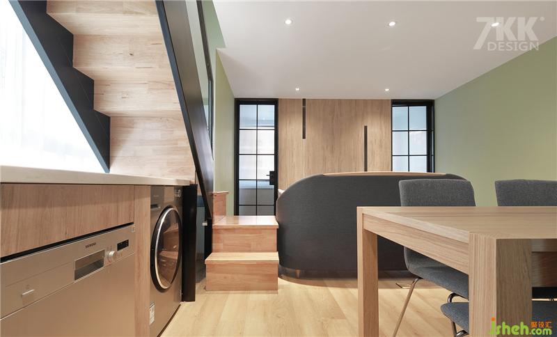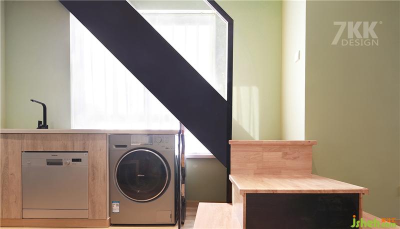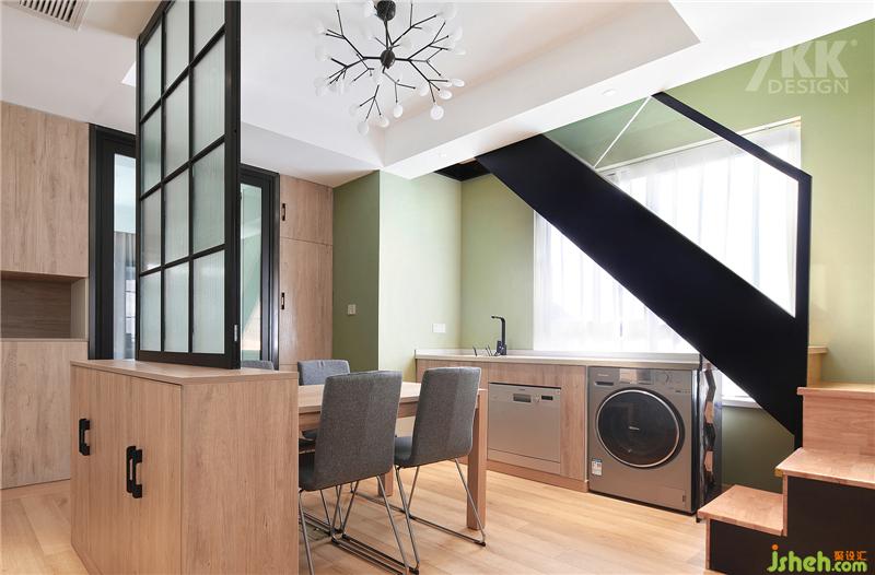 樓梯經(jīng)過巧妙的設(shè)計把陽臺推出去利用陽臺空間搭建樓梯,樓梯下面也是充分利用起來,靠墻做成吧臺,下面嵌入電器烤箱,微波爐,洗衣機,收納充足。 利用樓梯臺階把客餐廳的空間功能區(qū)域劃分,空間視覺卻又協(xié)調(diào)統(tǒng)一。
