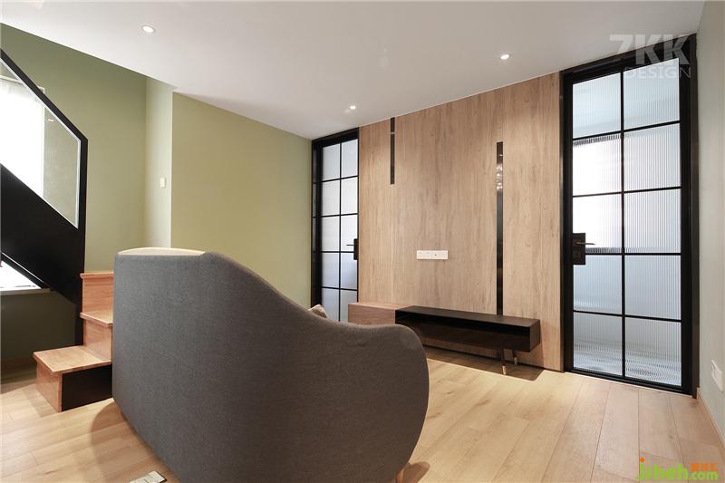 利用木飾面做的電視背景墻,電視還沒有放上去,我們就去拍攝啦,左邊是廚房,右邊是衛(wèi)生間,門都是采用玻璃材質(zhì),這樣客廳空間光線也比較充足,視覺上也比較寬敞通透。