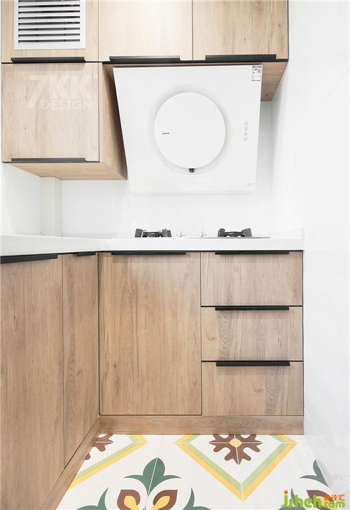 廚房只有2.9個平方,餐廳一側(cè)做的西廚吧臺,中西廚結(jié)合。清新跳色的瓷磚搭配干凈清爽的中廚環(huán)境。