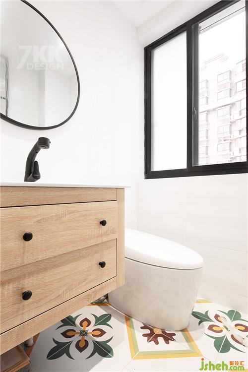衛(wèi)生間地磚也是采用清新的花紋拼接,圓形的藝術(shù)鏡子,一個(gè)臺(tái)盆柜一個(gè)馬桶,小而精致的空間,淋浴和浴缸設(shè)置到了主臥陽臺(tái)的空間。