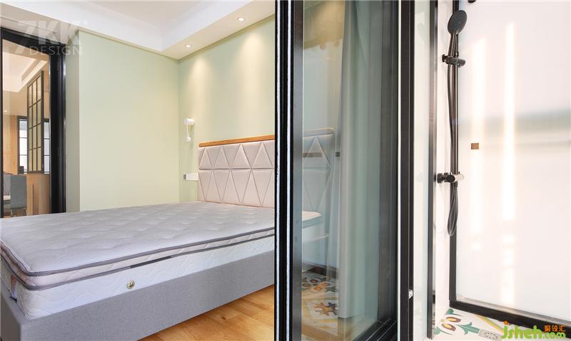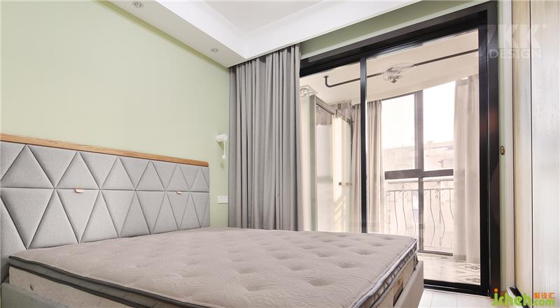 主臥,整體墻面和客餐廳采用統(tǒng)一的清新薄荷綠,上海裝修設(shè)計(jì)黑色邊框玻璃移門,淺灰色的窗簾搭配,打造優(yōu)雅清新品質(zhì)睡眠。