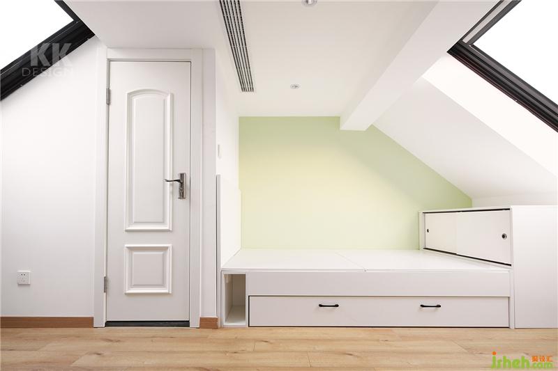 閣樓因?yàn)閷痈叩脑?,在空間利用率上也是定做為主,主要功能作為書房,客臥,還有衛(wèi)生間的空間以后有小孩也可以作為小孩房。中間最高處做了衛(wèi)生間的門,里面有淋浴馬桶,色調(diào)以白色系為主。斜頂兩邊的老虎天窗光線很好哦。