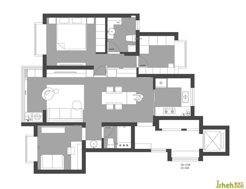 改造后的平面布局圖 秉著平時(shí)只有兩個(gè)人生活的狀態(tài)下,將空間功能達(dá)到舒適理想化的布局,讓家擁有更好的生活體驗(yàn)感。 1、將進(jìn)門看到的凸出的墻體打掉,利用走廊的空間定制餐邊柜,增加餐廳空間的使用功能。同時(shí)島臺(tái)與餐桌的設(shè)計(jì)也提升家的品質(zhì); 2、廚房移門設(shè)計(jì),可封閉可開放,增加空間視覺(jué)效果和互動(dòng)性,; 3、客廳陽(yáng)臺(tái)作為生活陽(yáng)臺(tái),一邊放置洗衣機(jī)烘干機(jī)+水池,一邊靠墻定制到頂?shù)墓耋w收納使用。陽(yáng)臺(tái)納入室內(nèi)空間,增加視覺(jué)感; 4,、把主衛(wèi)門改到過(guò)道,重新布局,主臥增加了一排衣柜作為收納; 5、北次臥改成衣帽間結(jié)合梳妝功能,與主臥和主衛(wèi)形成套房模式,全方位提升使用功能,擁有更好的品質(zhì)生活體驗(yàn)。 6、將原始主臥門改到客廳一側(cè),做成隱形門,與電視柜和餐邊柜齊平,突出整體效果; 7、南次臥做成了多功能房,兼具書房+影音室+次臥的功能。只需要一張沙發(fā)床,就可以解決,父母或者朋友臨時(shí)居住時(shí),打開沙發(fā)床即可。