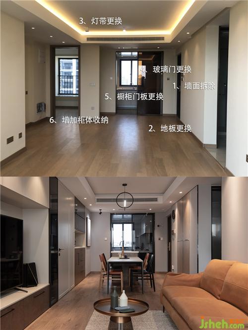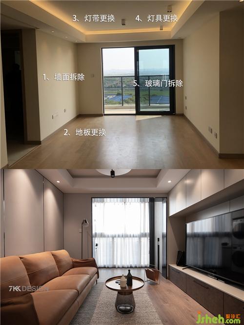 客廳改造前: 1、墻面拆除,沙發(fā)背景墻刷帶帶點(diǎn)灰度的乳膠漆,內(nèi)嵌黑色不銹鋼線條; 2、地板為了符合工業(yè)風(fēng)做舊的元素全部拆除替換; 3、原始燈帶比較偏黃,重新更換燈帶; 4、吊燈燈具更換成主燈,增加空間層次感; 5、陽(yáng)臺(tái)將原始的玻璃門拆除,陽(yáng)臺(tái)客廳一體空間更寬敞。