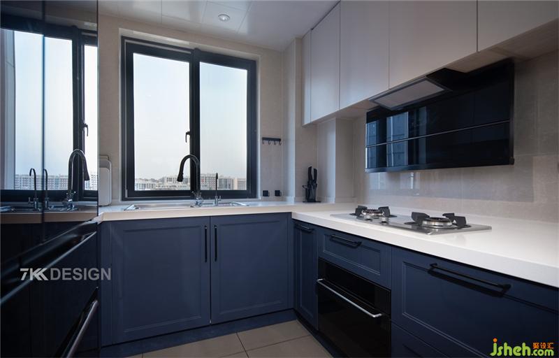 把原始廚房的櫥柜面板拆除掉,替換了深藍(lán)色的櫥柜,在光線的暈染下營造出一份靜謐與雅致。 廚房做玻璃移門設(shè)計(jì),隔離油煙,方便人進(jìn)出,還可以使家里的采光更好,更加通風(fēng)。