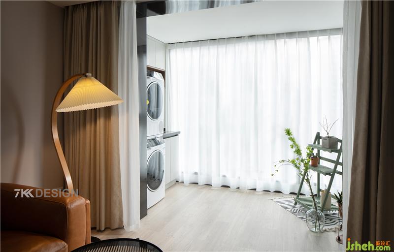 為了保持空間的整體性,地板一直延伸到陽臺,陽臺左側是功能區(qū),定制的陽臺柜,上下疊放的洗衣機、烘干機,洗好的衣服直接烘干方便整潔。