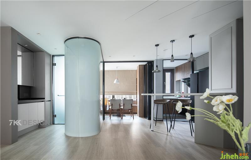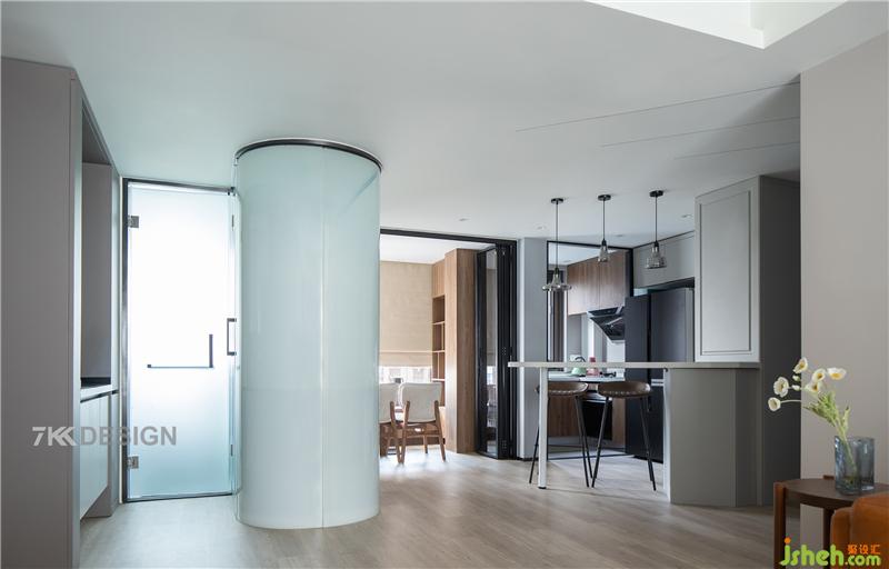吧臺的設計很巧妙,動線是斜上的,不會影響到走廊的動線,在一定程度上也是借用走廊的空間感,成為設計的一個亮點,吧臺造型既有創(chuàng)意感,又在創(chuàng)意上結合很多實用性。 吧臺一側是設備柜,嵌入式烤箱+冰箱,定制使得空間更好的利用,增加更多廚房的收納。