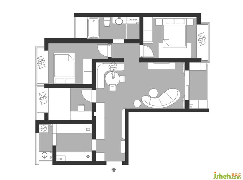 改造前原始戶型圖分析 由于是精裝房,業(yè)主預(yù)算有限,所以在格局上沒有大的改動。 房型是三房,比較緊湊,每個房間面積都比較小,收納空間不足。