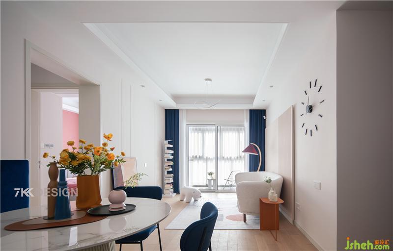 客廳整體延續(xù)餐廳白色的基底,粉色作為輔助色系,粉色是女業(yè)主比較喜歡的顏色,剛好孩子也是女兒,想打造清新浪漫的居家氛圍。
