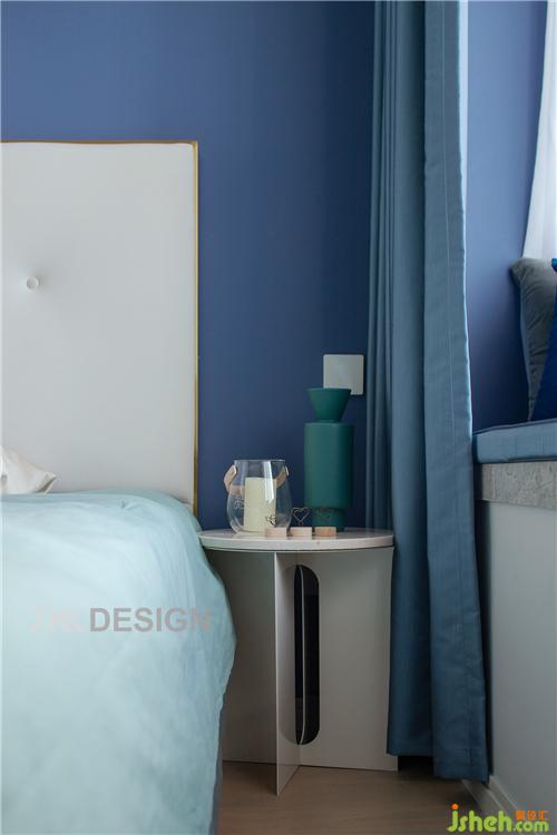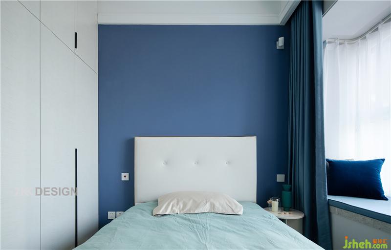飄窗外側是一層白色的窗紗,內(nèi)部是厚實的藍色窗簾,白天一層窗紗光線透過窗紗演繹空靈舒適的氛圍,夜晚拉上藍色的窗簾,享受安詳靜謐的睡眠時間。