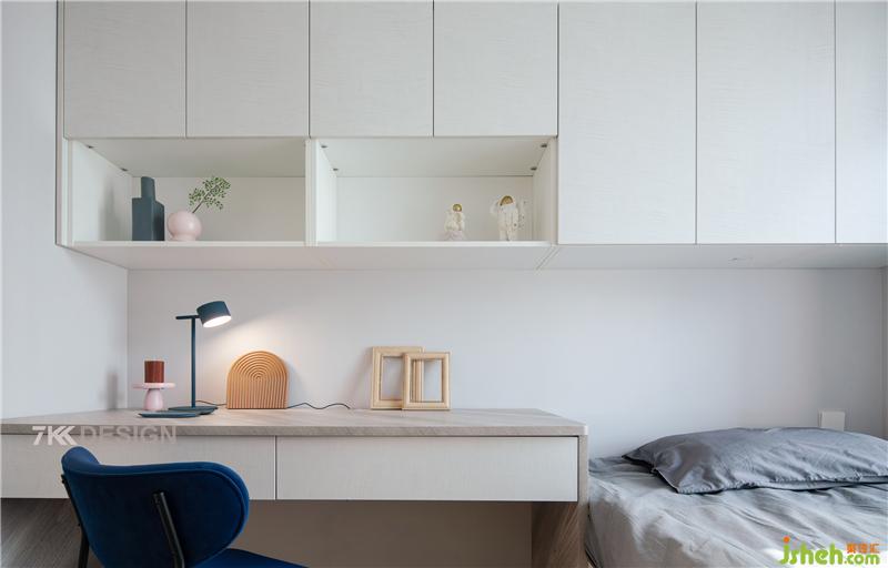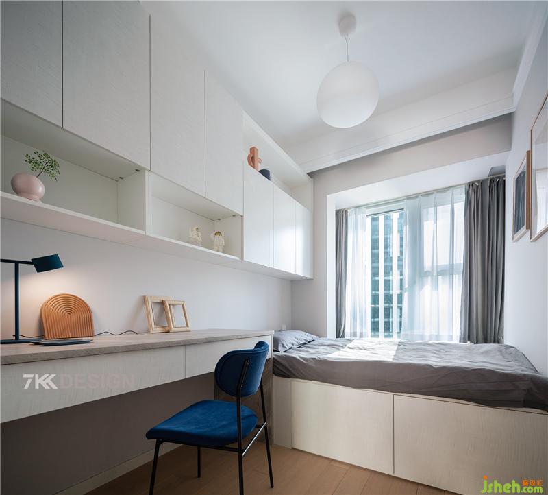 平時業(yè)主會在家辦公,最小的房間作為書房使用并兼具收納的功能,設計成榻榻米多功能房間。定制的榻榻米考慮到飄窗的高度,尺寸定制了500mm,和飄窗齊平,集床頭柜和書柜于一體,將空間利用率最大化上海室內(nèi)設計師。
