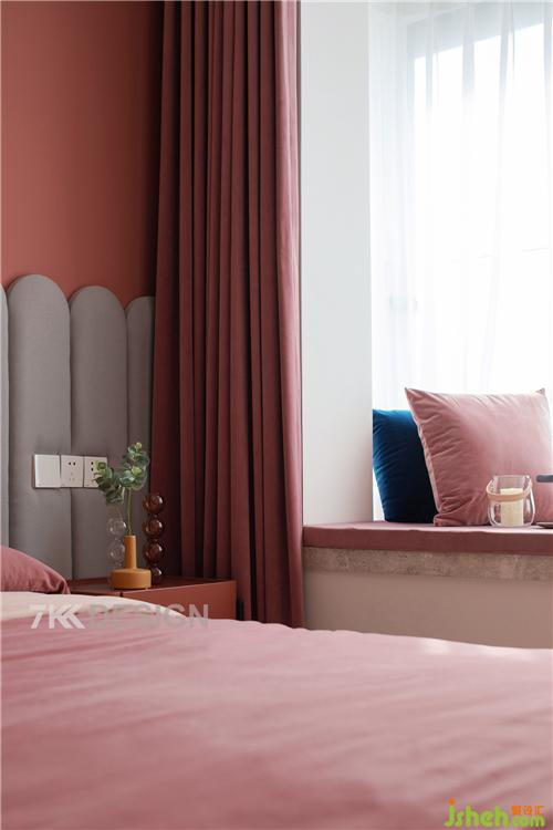 主臥改造前后對比:主臥將原始的硬包背景墻拆除,采用乳膠漆和拱形軟包拼接的造型相接合,上海室內(nèi)設計師整體以紅色系為主營造浪漫的睡眠空間。