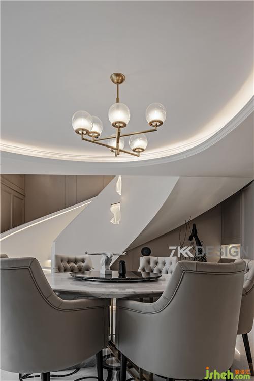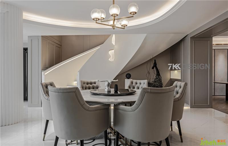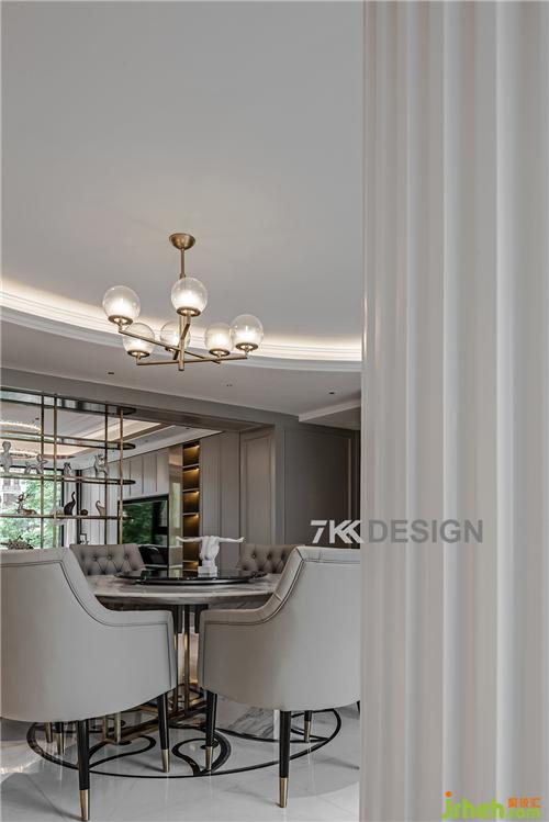 生活中的儀式感,從優(yōu)雅地用餐開(kāi)始,餐廳整體色調(diào)都以淺色系為基調(diào)。餐廳餐桌選擇圓形桌子搭配,與圓弧吊頂相呼應(yīng),吊頂旁邊的的圓柱包起來(lái),整體風(fēng)格打造歐式輕奢帶點(diǎn)時(shí)尚的元素。