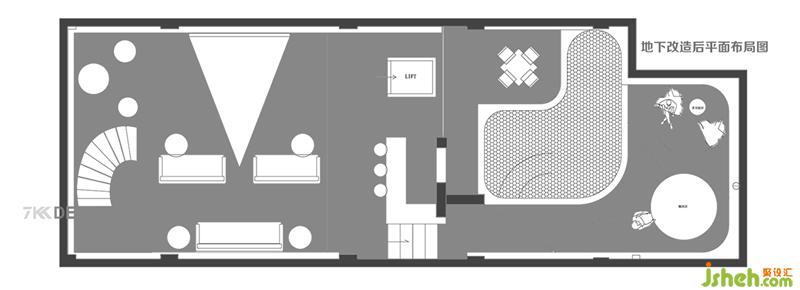 地下室改造后平面布局圖 地下室使用面積有145㎡ 地下室把原始樓梯改到南邊一側(cè)和一樓挑空設(shè)計(jì),為地下室引入更多自然光線,達(dá)到更好的通風(fēng)效果,地下室主要功能為影音室和兒童游樂(lè)園,為兒童打造夢(mèng)幻天地。