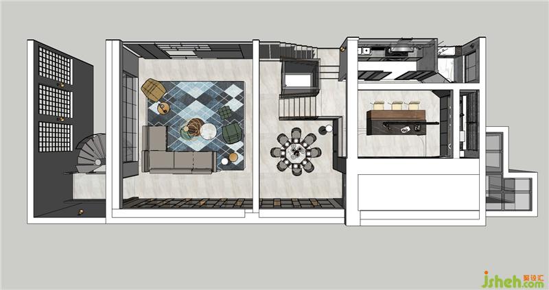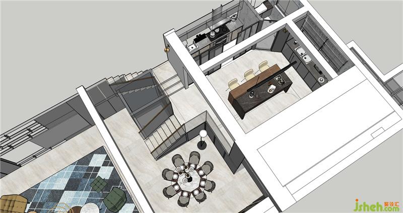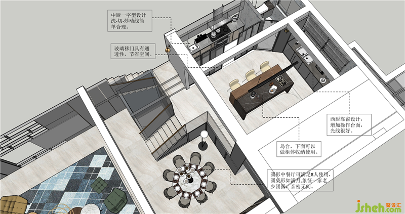 (一層和二層)夾層改造后平面布局圖 夾層出去樓梯使用面積有25㎡ 1、把一層到夾層的樓梯位置改到和電梯一側(cè)后,使得夾層和一層的互動(dòng)更近距離,大人在樓上做事情可以隨時(shí)看到孩子在樓下的動(dòng)向。 2、中廚一字型設(shè)計(jì),采用移門(mén)更節(jié)省空間。原始餐廳空間設(shè)計(jì)成西廚加島臺(tái)功能。一側(cè)定制到頂?shù)母吖?,容納設(shè)備柜和更多的儲(chǔ)物功能。 3、縮小原始中廚的面積,靠窗騰出的空間設(shè)計(jì)衛(wèi)生間,保留馬桶和臺(tái)盆的功能。衛(wèi)生間門(mén)一側(cè)斜角處理,為了容納馬桶的空間,讓衛(wèi)生間使用更寬敞舒適。