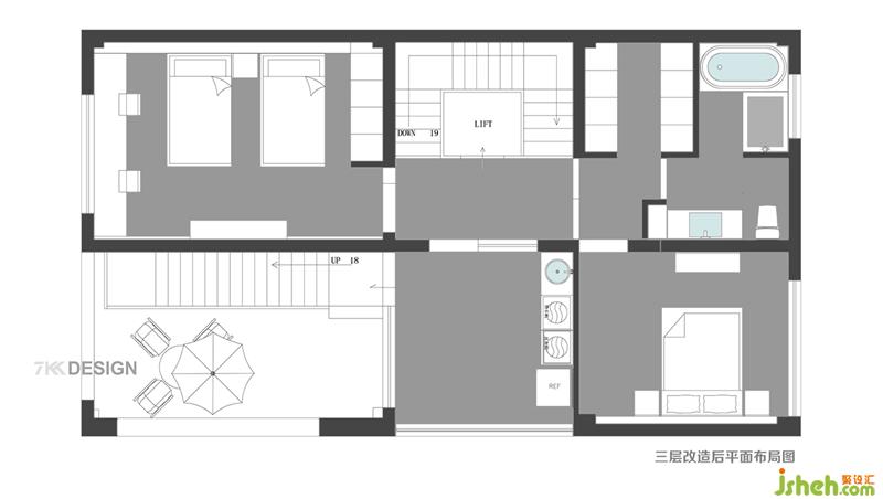 三樓改造后平面戶型圖 三層使用面積有90㎡ 1、樓梯上來(lái)南邊的一個(gè)臥室是兒童房,作為兩個(gè)男孩的休息空間,北邊臥室作為主臥是業(yè)主夫妻房。 原本兒童房作為主臥使用,后來(lái)改變功能一是因?yàn)閮蓚€(gè)男孩如果在北邊的臥室會(huì)覺(jué)得比較擁簇,其次他們找過(guò)風(fēng)水大師測(cè)算,北邊的臥室作為主臥使用會(huì)帶來(lái)好運(yùn)。 2、主臥外側(cè)是衣帽間和衛(wèi)生間空間。開(kāi)放式步入式衣帽間,衛(wèi)生間干濕分離,馬桶和臺(tái)盆中間采用玻璃隔斷,淋浴區(qū)單獨(dú)空間靠窗設(shè)計(jì)擁有更好的通風(fēng)效果。 3、重建的區(qū)域作為洗衣房,頂部部分玻璃搭建,采光通風(fēng)視覺(jué)效果都很好。剩下是部分露天陽(yáng)臺(tái),準(zhǔn)備后期做別的功能使用,暫時(shí)也是晾曬空間。