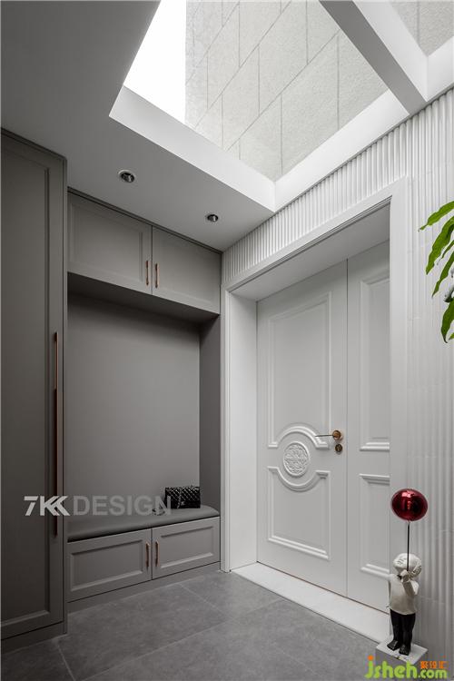 入戶門外邊的小庭院雖然面積不大,但是效果很贊,頂部采用透明玻璃頂,采光充足??繅D(zhuǎn)角做到頂?shù)母吖?換鞋凳一體設(shè)計(jì),進(jìn)門可以放置臨時(shí)進(jìn)出的物品,坐著換鞋很方面。柜體選擇高級(jí)灰,進(jìn)戶門選擇白色歐式造型門,高貴莊嚴(yán)大氣又含蓄雅致。最吸引眼球的是角落的裝飾品,小孩拿著紅色的氣球,似乎在迎接主人到來(lái),很有樂(lè)趣。讓莊重內(nèi)斂的庭院瞬間變得活力有趣味。