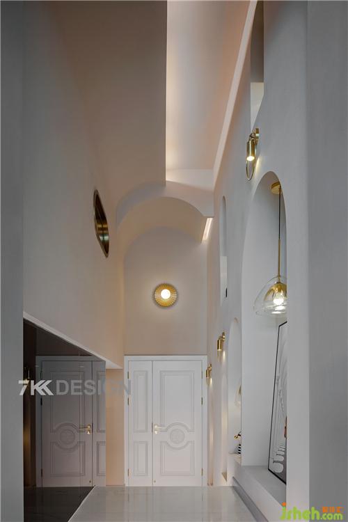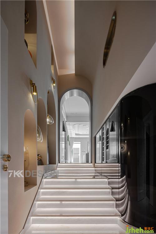 從臺(tái)階上來(lái)還有著3m的高度,其中拱形造型的應(yīng)用讓空間在視覺(jué)上顯得更高,呈現(xiàn)柔和優(yōu)美的曲線和弧度。進(jìn)門頂部的弧形和到客廳的弧形造型相呼應(yīng),與客廳之間起到空間上的隔斷和過(guò)度。從進(jìn)門可以看到很多金屬元素的應(yīng)用,點(diǎn)綴出不一樣的輕奢感。 左邊弧形玻璃上面我們看到金屬邊框的造型,從夾層可以看到它的驚艷之處,透過(guò)玻璃可以看到樓梯走廊空間的動(dòng)向。