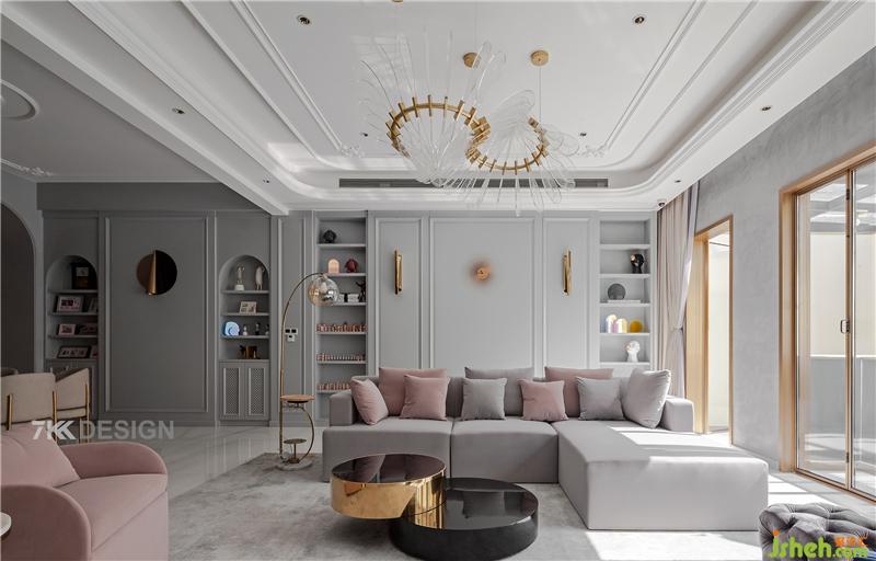 客廳進(jìn)來(lái),整個(gè)墻面延續(xù)之前的拱形門造型與層板結(jié)合,上面擺放精致的裝飾品,美觀與實(shí)用并存??蛷d白色與灰色為基調(diào),金屬元素點(diǎn)綴。軟裝上搭配粉色系,打破客廳的清冷與單調(diào)。頂部不同區(qū)域的吊頂處理使得空間層次感更加豐富。午后的陽(yáng)光透過(guò)大面積的玻璃窗照瀉進(jìn)來(lái),很明媚的感覺(jué)。