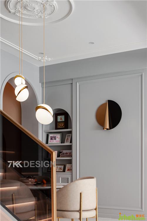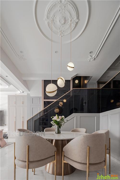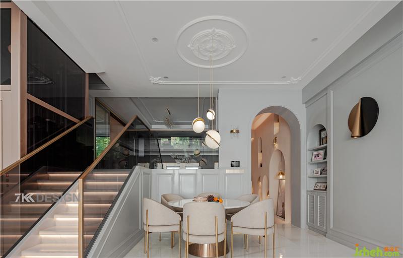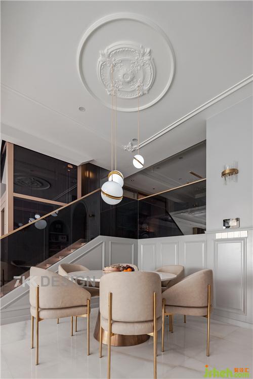 改變原始樓梯騰出中餐廳的位置,吊頂頂部圓形的造型設(shè)計與圓形桌子的搭配相呼應(yīng)。從樓下的空間透過玻璃可以看到樓上的動態(tài)。樓梯扶手也是選擇玻璃材質(zhì), 顯的空間輕盈通透。玻璃的隔斷使得樓上樓下隔而不斷,形成很好的互動性。