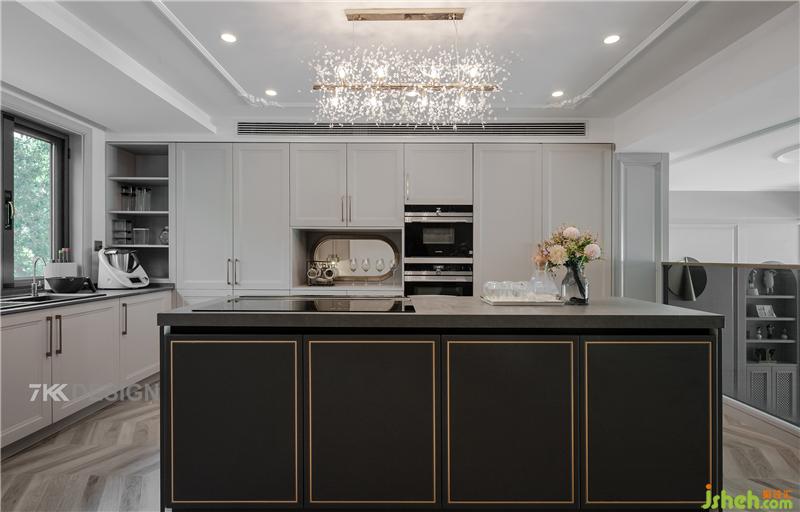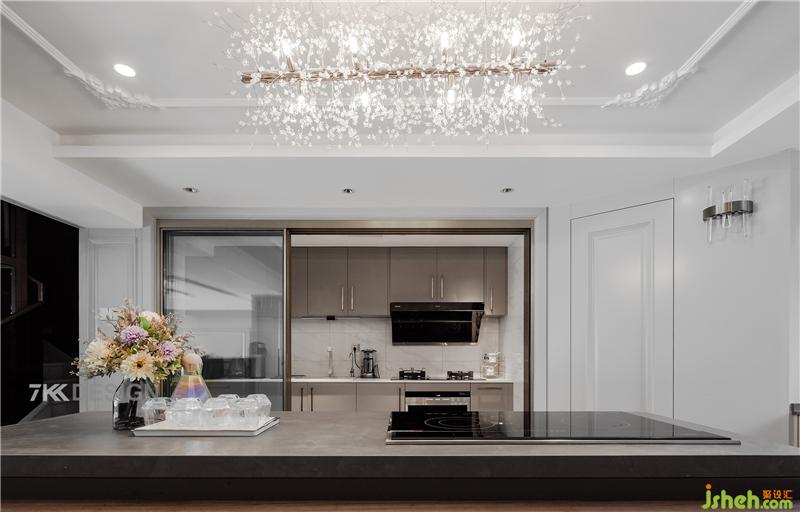 西廚加島臺功能區(qū)域,寬敞大氣。原始中廚縮小了空間,設(shè)計西廚增加更多的操作功能和儲藏空間。中部島臺加吧臺的設(shè)計,提升空間格調(diào),島臺下面還有收納空間,非常實用。上方的藝術(shù)吊燈裝飾為空間增加藝術(shù)氛圍。正面一側(cè)定制到頂?shù)母吖?,里面容納設(shè)備柜(雙開門冰箱+烤箱+微波爐)和更多的儲物功能。