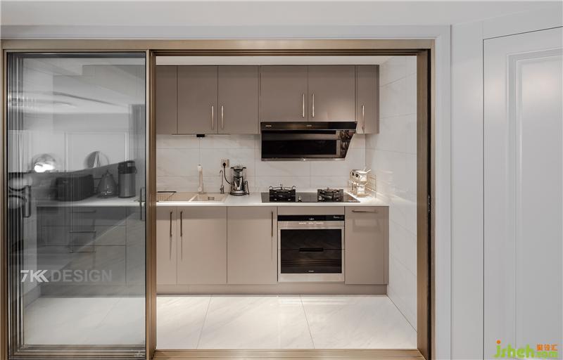 廚房一字型設(shè)計,白色地磚拼接,玻璃移門金屬邊框,營造簡潔大氣時尚的烹飪環(huán)境。