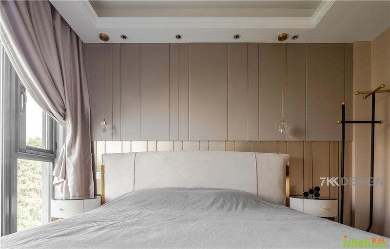 這是三樓的主臥,業(yè)主夫妻的房間,窗戶朝北,原本是選擇朝南的方向,因為風(fēng)水大師的緣故選擇了這間朝北的臥室。主臥整體選擇大地色系中較淡的顏色為主,賦予臥室靜謐又靈動的氣質(zhì),仿佛流淌的詩句般優(yōu)雅。