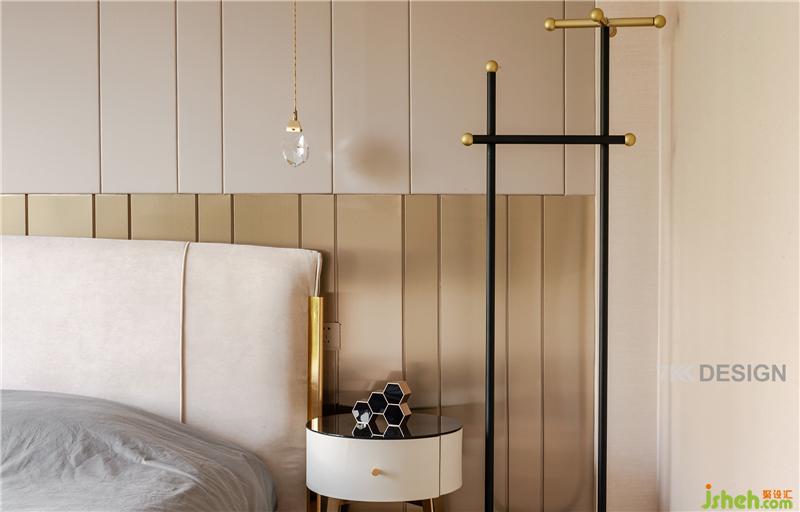 床頭吊柜下面結(jié)合豎型的造型拼接,增加線條層次感。圓形簡約床頭柜擺放幾何形拼接的裝飾品,充滿藝術(shù)感。旁邊黑色簡約的線條衣架,為臥室擺放衣物增加便利性。
