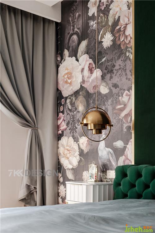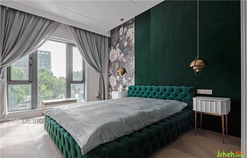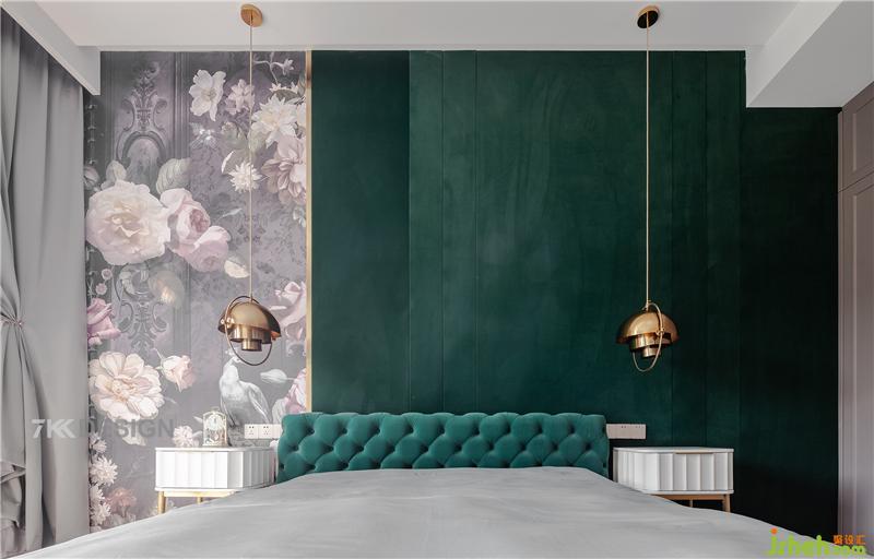 為方便父母的使用,把二樓朝南的一間臥室作為父母房,可以看出業(yè)主對父母深切的愛。父母房床頭背景墻采用大面積墨綠色與花型圖案拼接,床也選擇墨綠色軟包樣式,短毛絨布,手感柔和,輕奢典雅。細看吊頂內(nèi)嵌燈帶,打開燈有種科技感相融合。