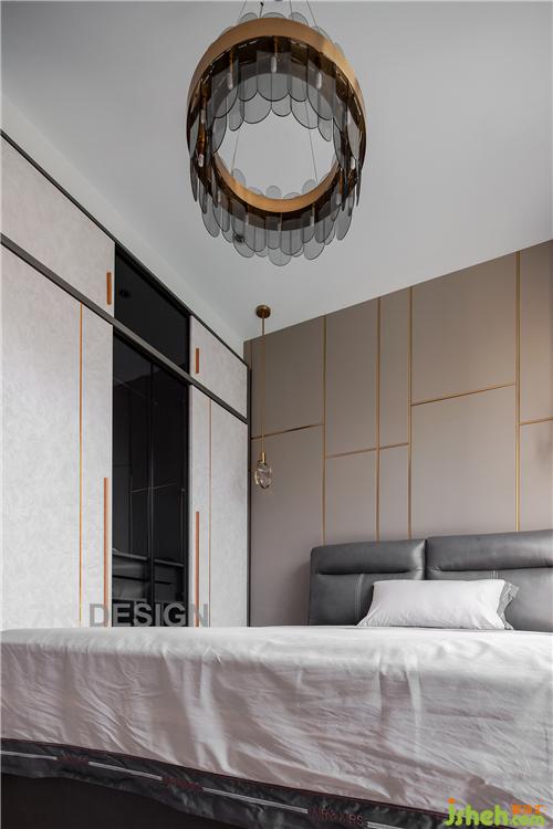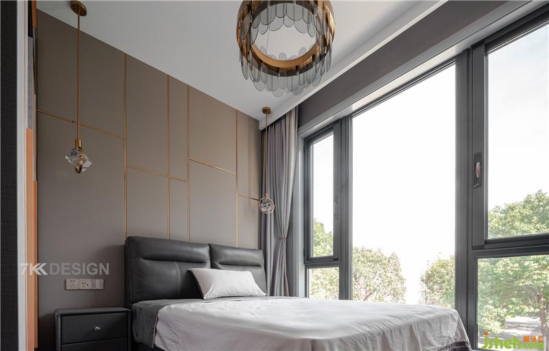 床頭選擇左右對稱的金屬色吊燈增加光源。