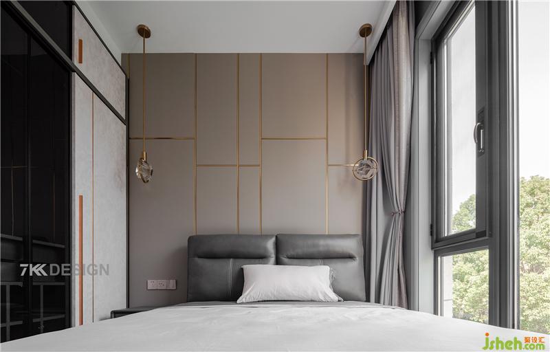 二樓客臥空間是后來重新搭建的空間,納入室內(nèi)使用。即使客臥也設(shè)計的精致舒適,床頭背景墻采用軟包材質(zhì)金屬條紋鑲嵌,兩邊搭配精致吊燈,灰色床頭軟包,雙層窗簾搭配營造質(zhì)感舒適的睡眠環(huán)境。