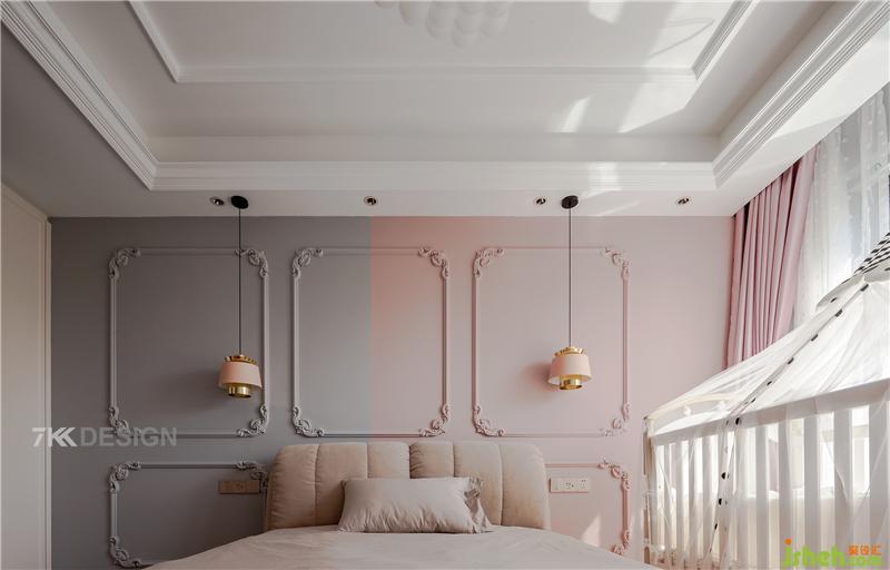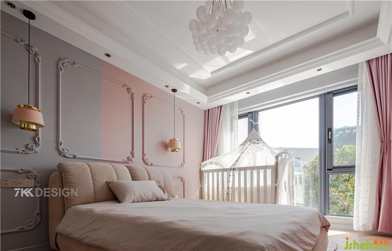 二樓朝南的女兒房法式風(fēng)情,浪漫夢幻。床頭背景墻粉色與淺灰色拼接,墻面上用石膏線勾勒出經(jīng)典的線條,盡顯法式優(yōu)雅。天花板搭配白色球狀吊燈造型優(yōu)美,粉色窗簾與粉色背景墻相呼應(yīng),明亮寬敞的空間,整體充滿連貫性。