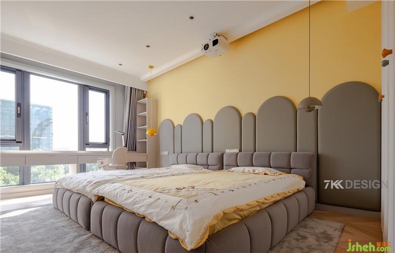 三樓男孩的房間,兩個雙人床拼接一起,促進兄弟的感情,親密無間。更方便互動玩耍,釋放孩子的天性。床頭背景選擇明快的黃色與拱形幾何體軟包拼接,打造童趣世界。