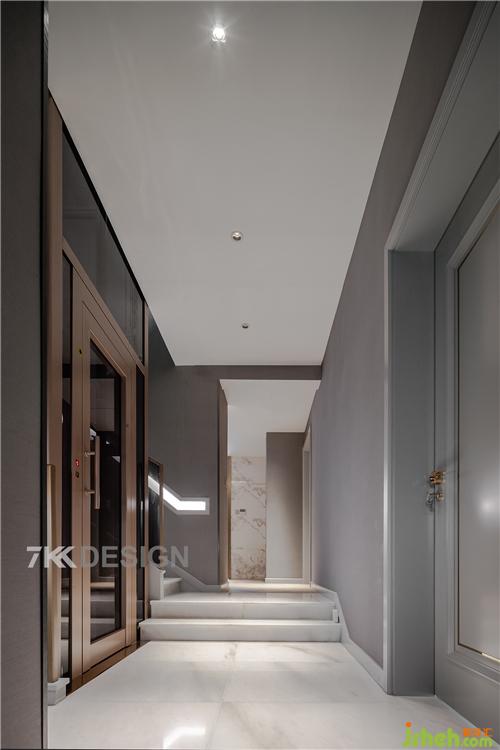 三樓走廊,走廊左側是電梯位置,右側是后來重新搭建的洗衣房空間。選擇玻璃移門使得走廊空間光線充足,整體空間寬敞明亮。走廊盡頭進去是主臥和衣帽間及衛(wèi)生間空間。地面選擇地磚與地板拼接,劃分功能區(qū)域。