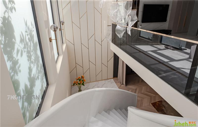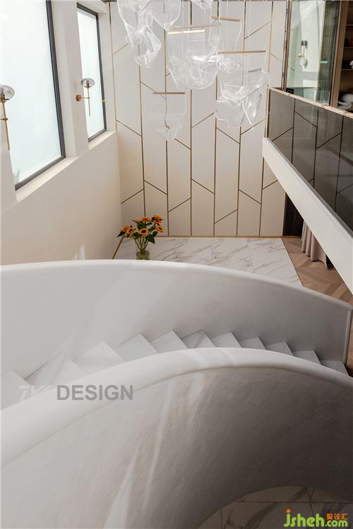 弧形樓梯上方搭配藝術吊燈,豐富空間層次感,美觀實用。