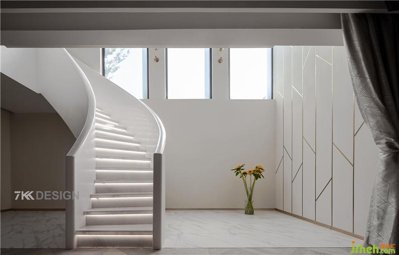 地下室弧形樓梯,扶手線條柔美流暢,臺階內藏燈帶唯美夢幻。挑空下面大面積的空間留白設計,凝聚視覺永恒 ,充滿更多想象。