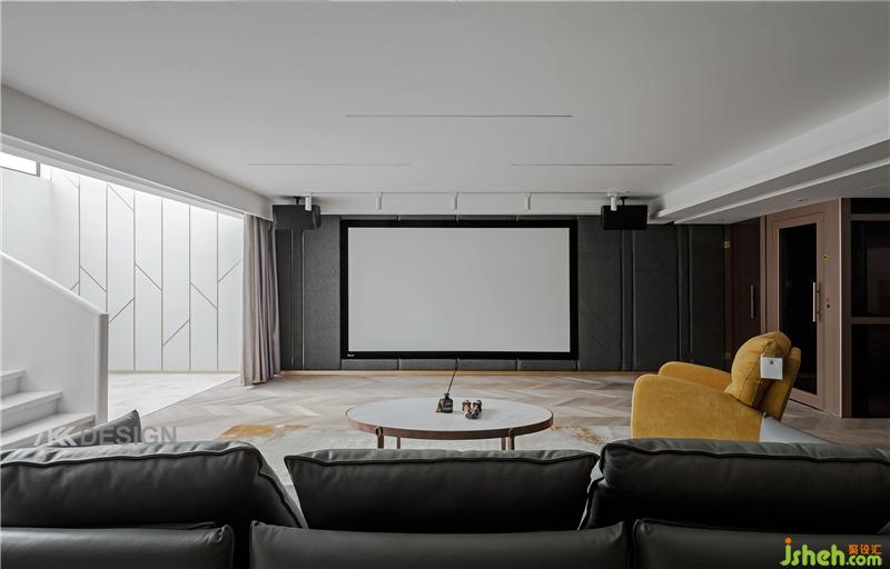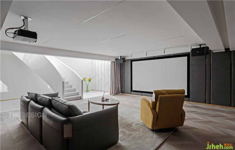 地下室影音室,墻面采用灰色軟包材質,減少噪音。選擇內嵌投影幕布,享受強大的視覺效果,頂部嵌入式燈帶設計,閑暇之余,在這樣寬敞的空間里,聽著音樂或看一場電影,享受一場全身心的放松是何等的愜意。