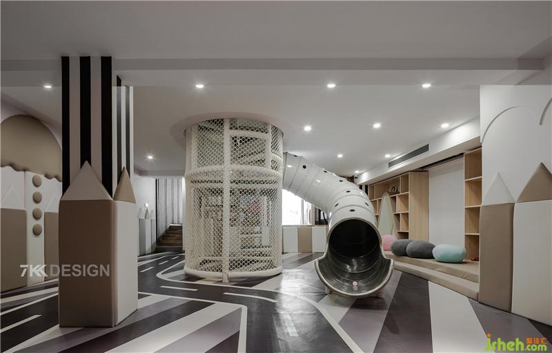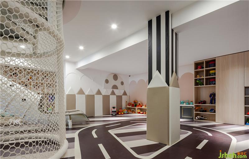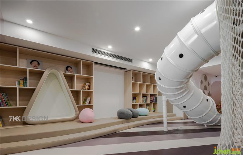 從影音室進來又是一番天地,屬于小孩子的歡樂世界,地下室游樂園,里面有跑道,滑滑梯,小廚房,畫畫墻,圖書角。真的好有愛的設計,連大人都羨慕。作為這對夫妻的小孩真的是超級幸福。從滑滑梯上去可以通到一樓,進門玄關可以看到網狀的結構上海別墅裝飾。