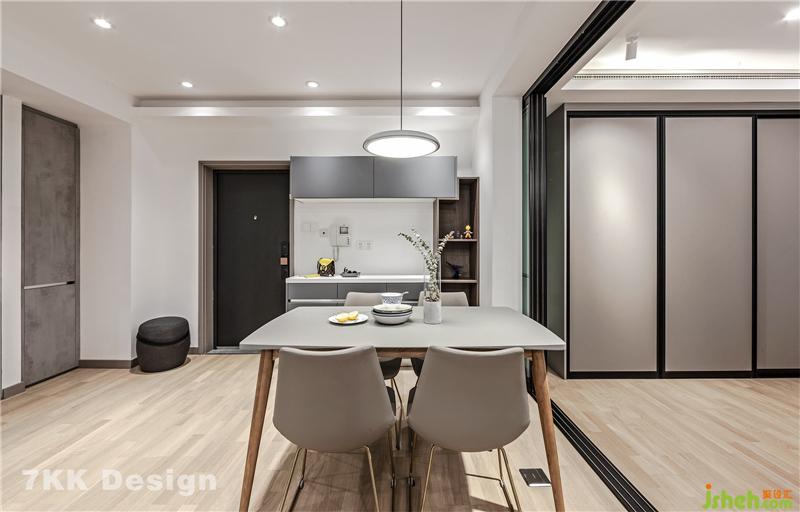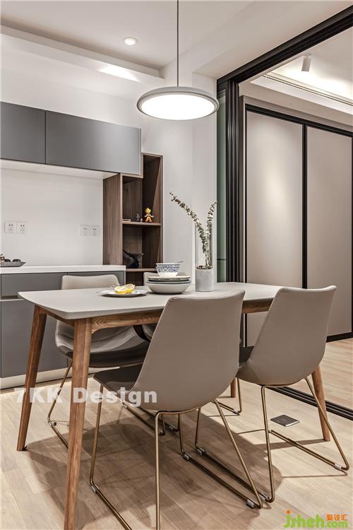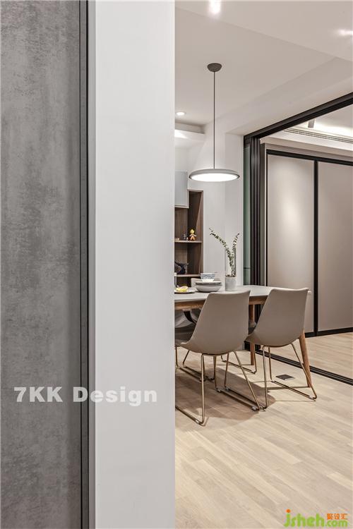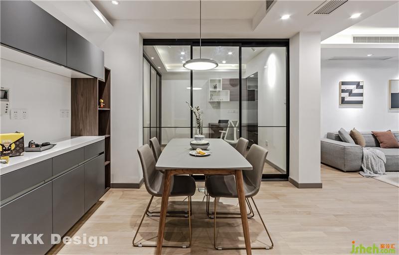 餐廳的亮點就是大面積滑軌移門,它的隔音效果非常棒,后面的私人的辦公地方,只要覺得外面吵就可以拉上門,不管是在移門的厚度上還是在定向滑動,幾乎沒有噪聲。旁邊的收納柜,平時放置一些物品以便出門方便拿取上海室內(nèi)設(shè)計師。